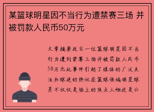 文章摘要:近日,一位篮球明星因不当行为遭...